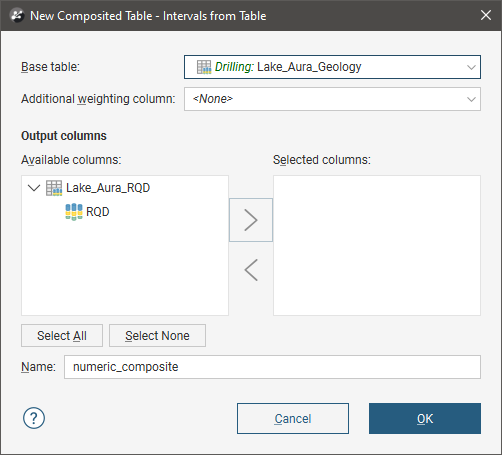 The value assigned to each interval will be the length-weighted average value, and you can use an Additional weighting column. This column must contain valid (positive) values for all of the composite’s output intervals. If this is not the case, you will receive a message saying the table cannot be created. If the column selected as the weighting column is also in the list of output columns, that output column will be composited using length-weighted averaging only.