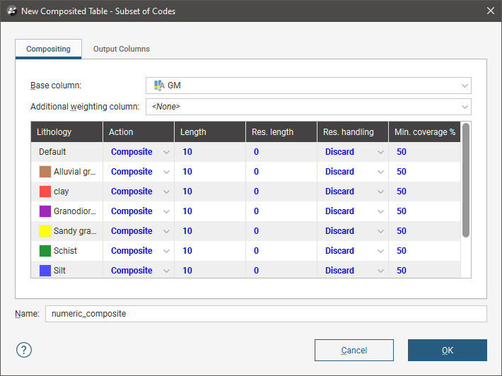 When compositing is carried out using the Subset of Codes option, some codes can be excluded from the composited table or the raw data from the Base column can be used. When compositing is applied to a code, the same parameters apply as for the Entire Borehole option, but different codes can use different Compositing length and Minimum coverage parameters.