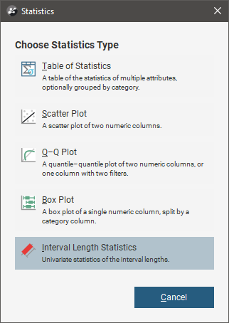 The Interval Length Statistics graph is a univariate graph, so for more information on the options available, see Univariate Graphs in the Statistics topic.