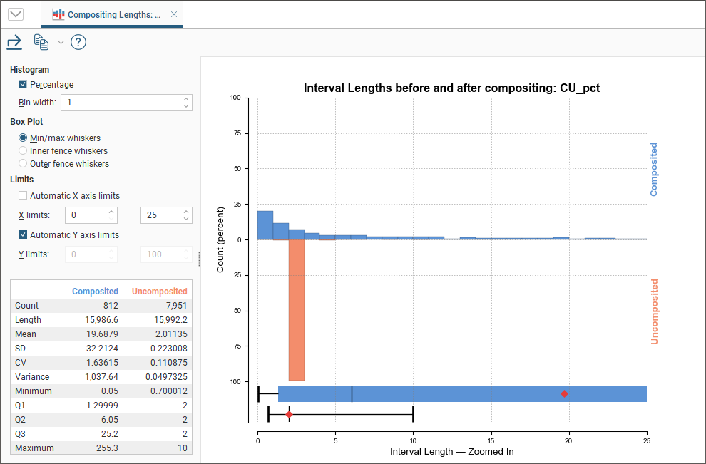 The double histogram, one displaying the distribution of the raw data and one displaying the distribution of the composited data, enables comparison of the two distributions of the same element before and after the compositing transformation. Impacts on the symmetry of distributions will be evident.