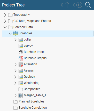 Here, a single drilling dataset made up of a number of tables has been added to the project, stored in the Borehole Data folder: