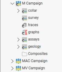 In addition to the imported tables, each drilling dataset has two objects that help in visualising and analysing the data. These are: