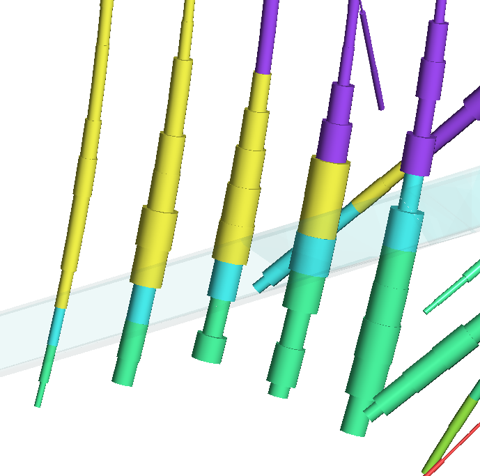 This scene view shows boreholes with the radius sized proportionally to the assay value, and coloured according to lithology, once the lithology information was added as an evaluated column to the assay table. A vein volume is shown in transparent blue to show the relationship between the geological model volume and the evaluation at the interval mid-points.