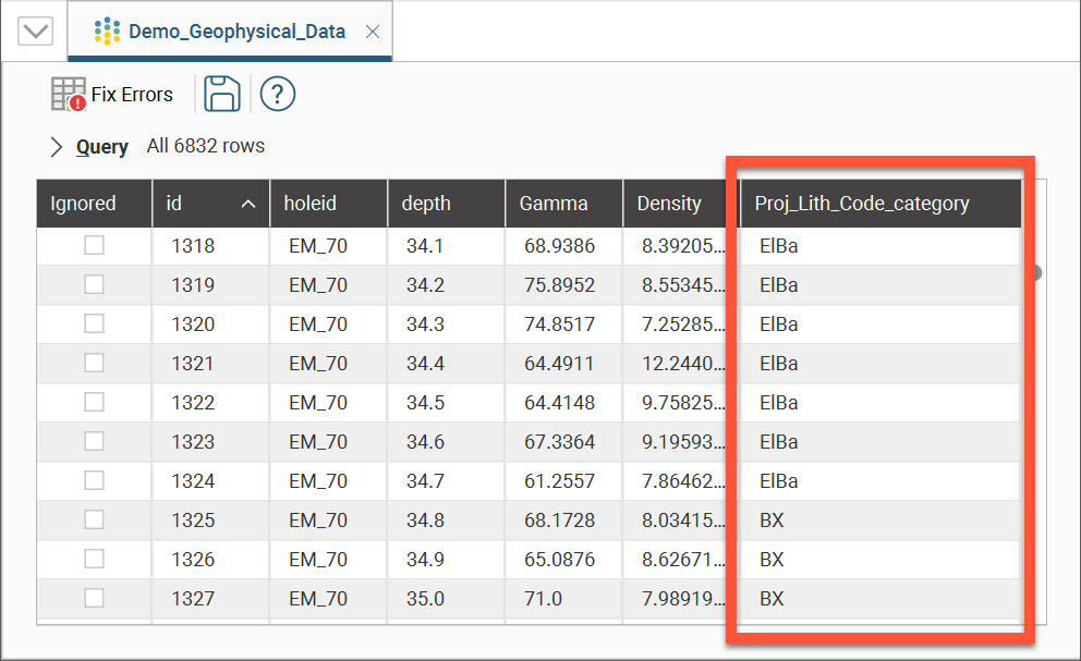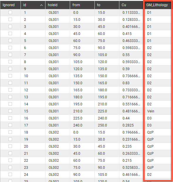 A column will be added to the table, with each existing entry receiving a category evaluation based on where the downhole location is relative to the interval category data. If the depth is greater than or equal to the category column’s interval ‘from’ depth, and less than the interval’s ‘to’ depth, the location will be assigned the code of that interval.