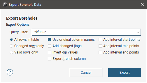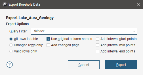 You can select whether the exported file includes all rows, only changed rows or only valid rows. You can also apply a query filter, if any have been defined for the drilling dataset.