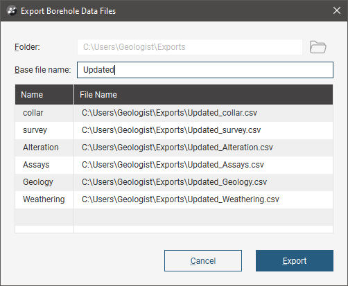 To export a single drilling data table from a drilling dataset, right-click on that table and select Export. The Export Borehole Data window will appear: