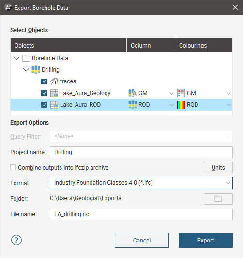 Drilling data can also be exported in IFC format via the bulk exporter. See the Exporting Project Data to IFC topic for more information.