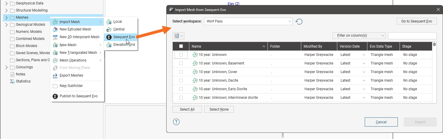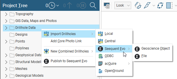 To start importing data from Seequent Evo, right-click on a folder in the project tree and choose the Seequent Evo option from the Import menu: