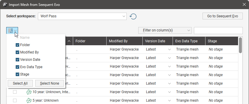 ), you can choose which columns appear in the table, which can assist in selecting which data to import when the workspace contains a lot of data.
