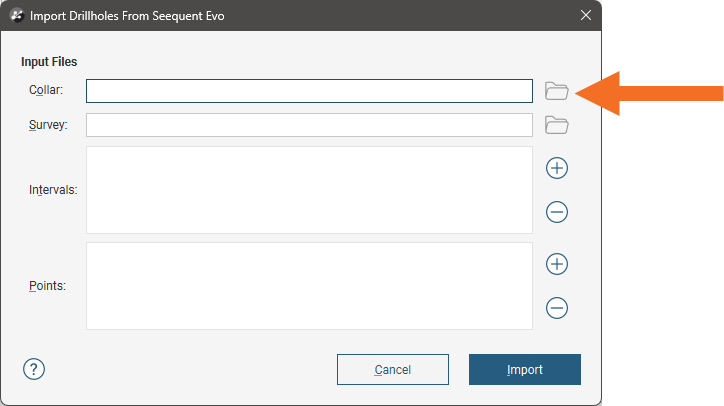 In addition to importing drilling data from Evo’s Geoscience Object service, you can also import drilling data from Evo’s File service. To do this, right-click on the Borehole Data folder in the project tree and select Import Boreholes > Seequent Evo > File.
