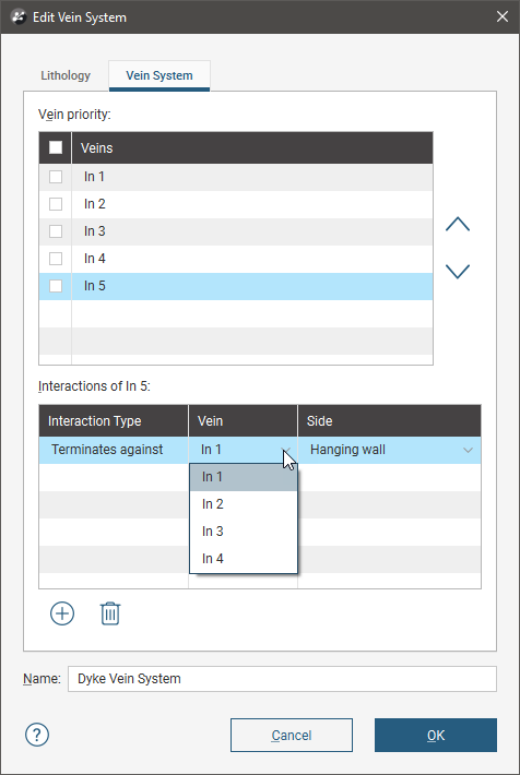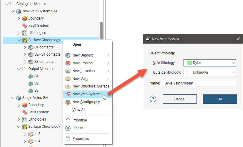 To create a vein system, right-click on the Surface Chronology and select New Vein System. In the window that appears, select the Vein lithology: