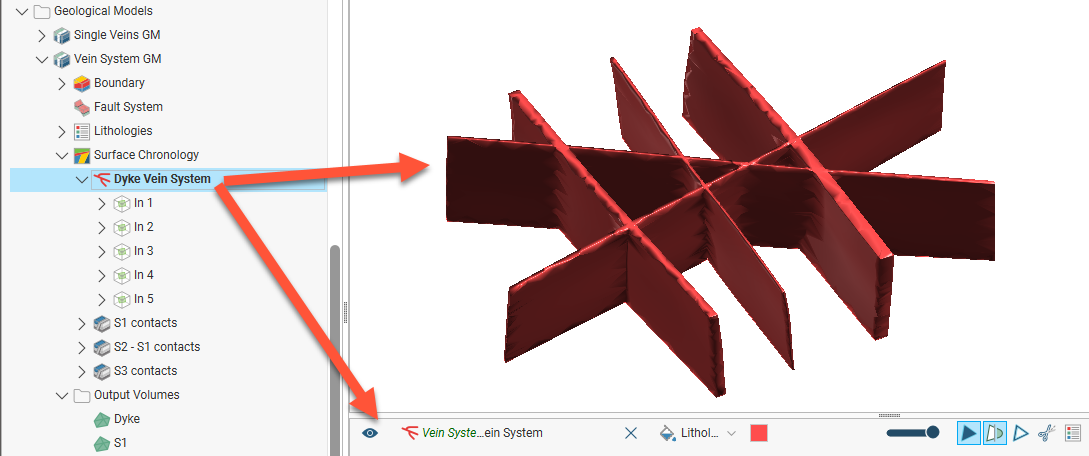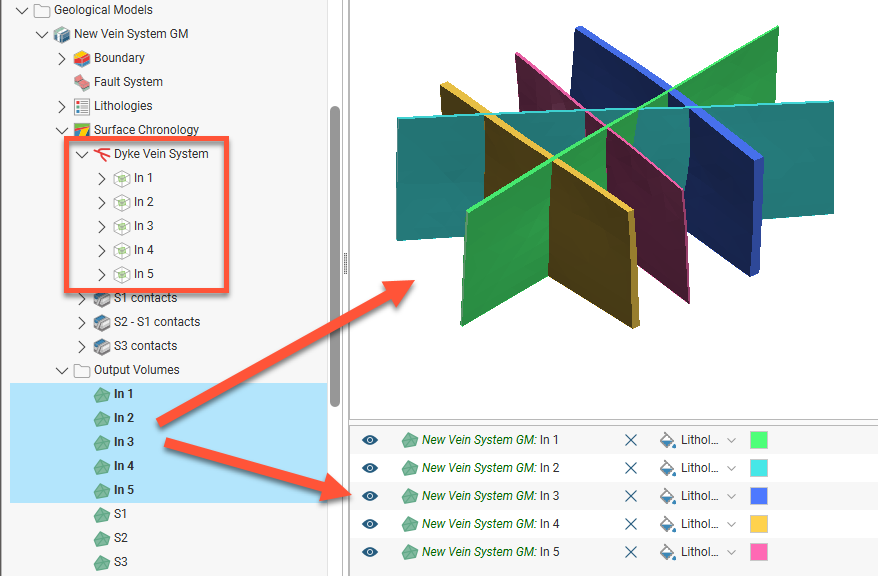 When a vein system is enabled in the geological model, the default setting is that it will produce a single output volume in the geological model that is assigned the Vein lithology set for the system. For example, here enabling the vein system results in a single “Dyke” output volume: