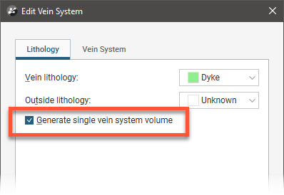 To switch between a single vein system output volume and separate vein output volumes, double-click on the vein system in the project tree. In the Lithology tab, change the Generate single vein system volume setting: