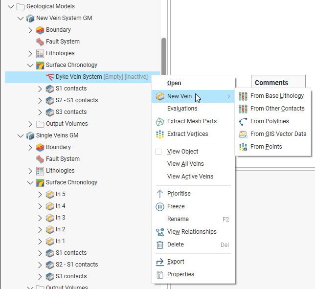To add veins to a vein system, right-click on the vein system and select one of the New Vein options. These are the same options used to add a new vein directly to a Surface Chronology, and are more fully described in New Vein From Base Lithology, New Vein From Other Contacts and Veins From Other Data.