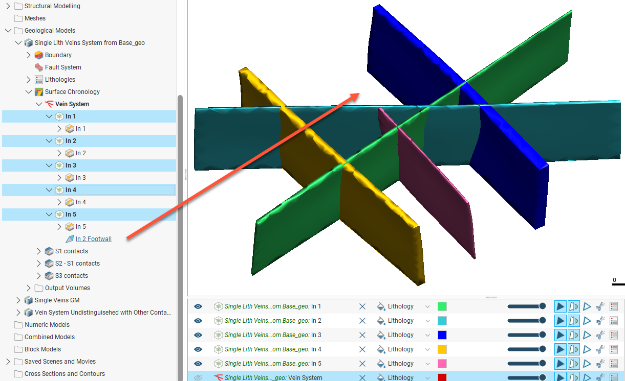 Or, just as in the case with each vein being modelled as a separate vein, each vein could be coded uniquely. An advantage of using the vein system is that relationships between the veins documenting their interaction can be modelled, as in the case of the pink vein terminating against the footwall of another vein: