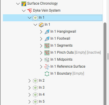 The techniques for refining veins that are part of vein systems are the same as those for individual veins added to the Surface Chronology. Expand each terminated vein inside the vein system in the project tree to work with each part of the vein: