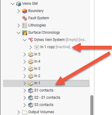 Click OK to create the new vein. The new contact surface will appear in the project tree under the Surface Chronology. Expand the vein in the project tree to see how it was made.