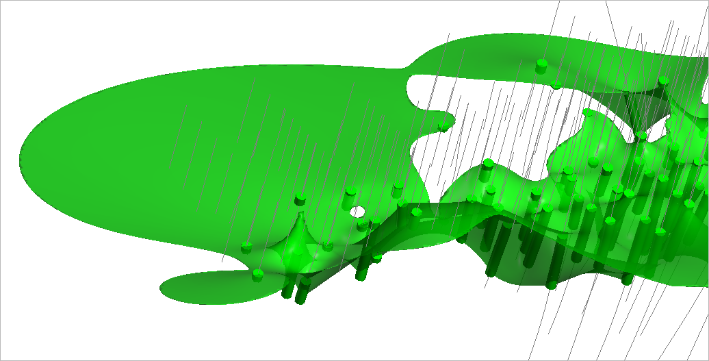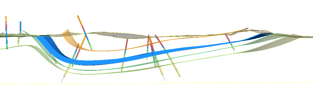 Here, a thin folded layer has been modelled using a vein, created from a base lithology using sparse drilling data. The vein does not conform to known geology, crossing other modelled surfaces.