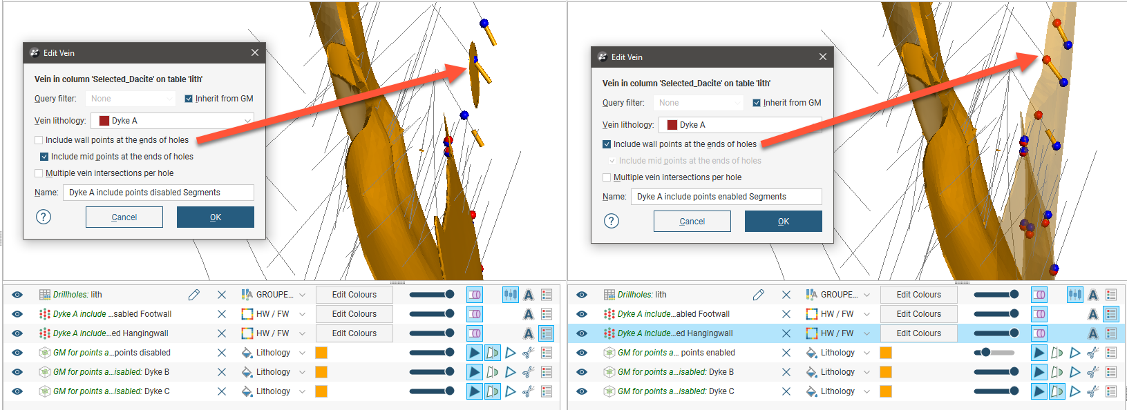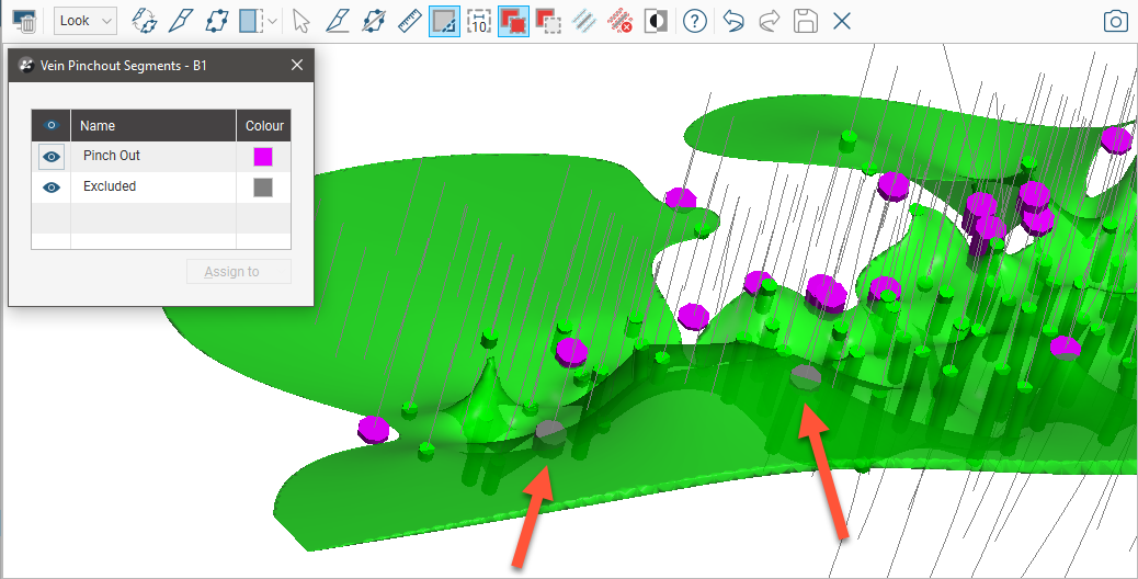 ) to view the effect of the excluded pinch out segments on the vein. In this example, excluding the two segments results in the vein terminating at the boundary of the geological model: