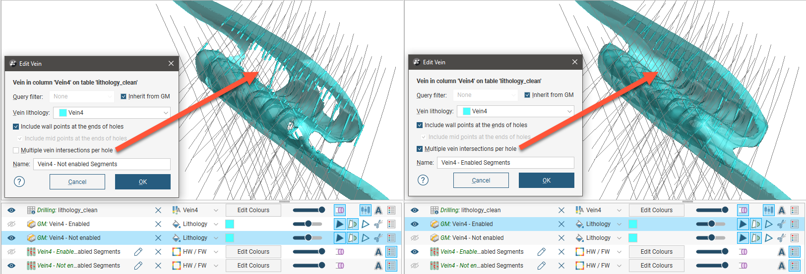 The Multiple vein intersections per hole setting is useful situations where boreholes might pass in and out of the same vein unit multiple times. Here a folded vein is shown with Multiple vein intersections per hole disabled (left) and enabled (right):