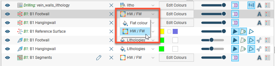 Displaying the different objects that make up the vein can help you in making decisions on how to edit the vein. There are some settings specific to veins, such as the option for displaying different vein components by their hangingwall/footwall assignments:
