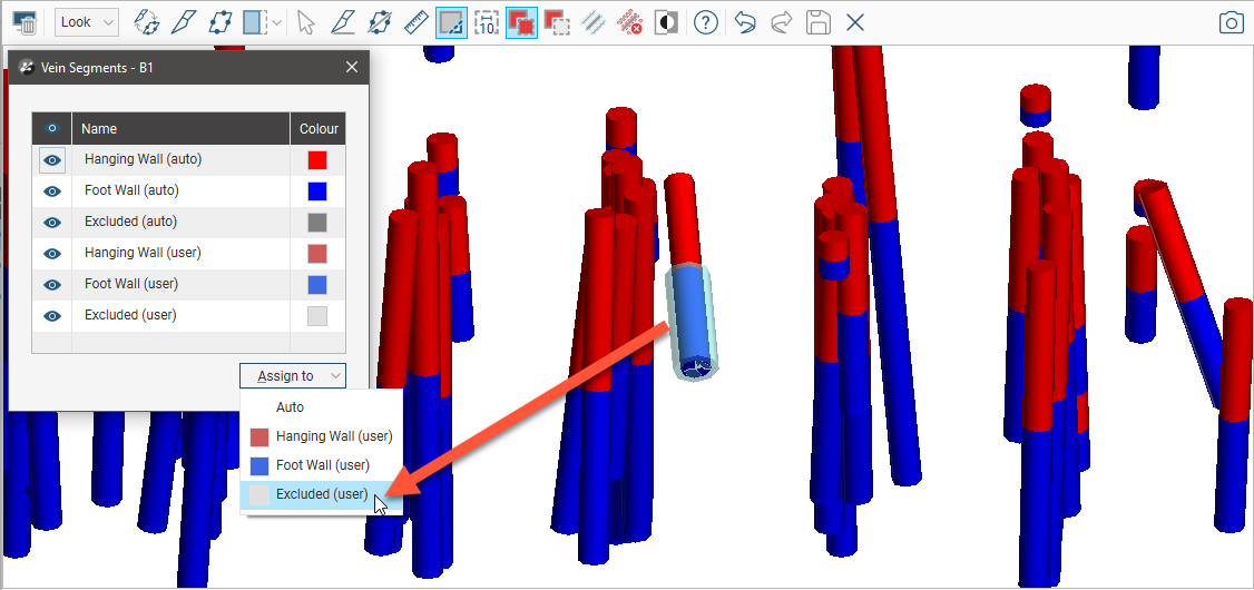 To revert to the categories assigned by Leapfrog Works when the vein was created, select some segments and then assign them to the Auto category: