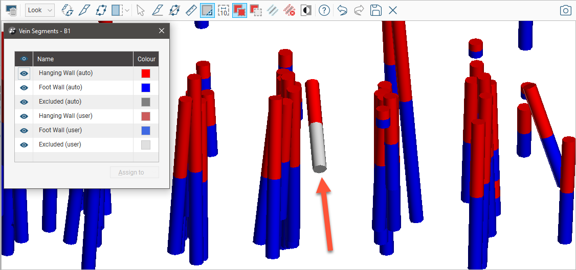 - Hanging Wall (auto), Foot Wall (auto) and Excluded (auto). These are the categories Leapfrog Works assigned segments to when the vein was created.