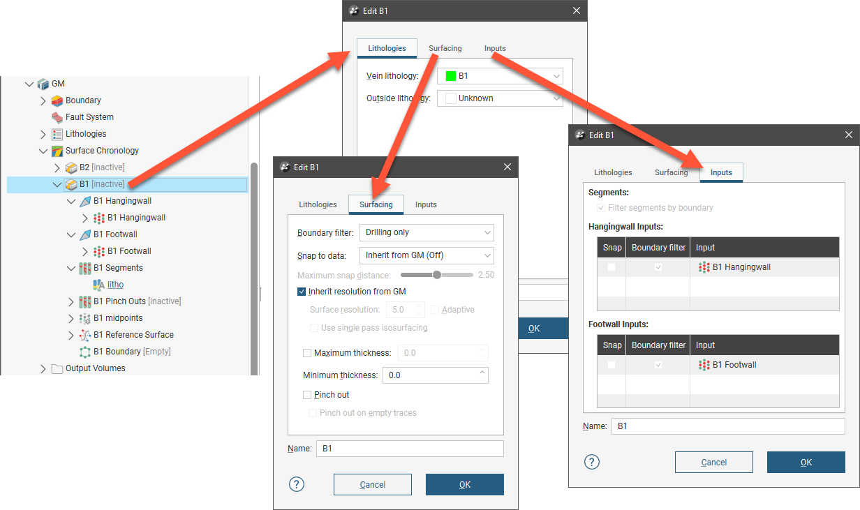 Double-click on the reference surface in the project tree; this opens the Edit Vein Reference Surface window and you can see what option is being used for the surface. In this example, the B1 vein has been created from lithology data and so it has a curved reference surface and the midpoints for the vein lithology are used as Input values: