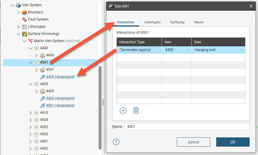 ) and any interactions with other veins in the vein system. Here vein 4501 interacts with vein 4400 on its hangingwall side, and so vein 4400’s hangingwall side is hyperlinked to vein 4501.