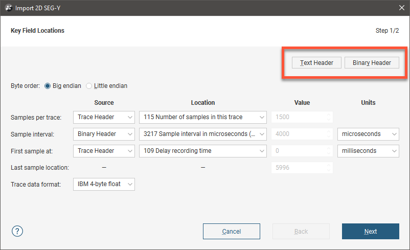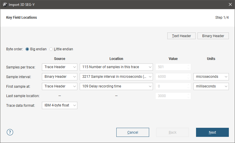 There are four steps to work through. In the last step, you can choose how many slices to import. First, set up the Key Field Locations. There are buttons at the top of the window for displaying the Text Header and Binary Header, which may be useful in deciding what import settings to use.