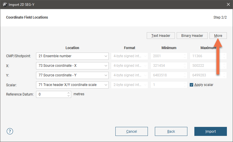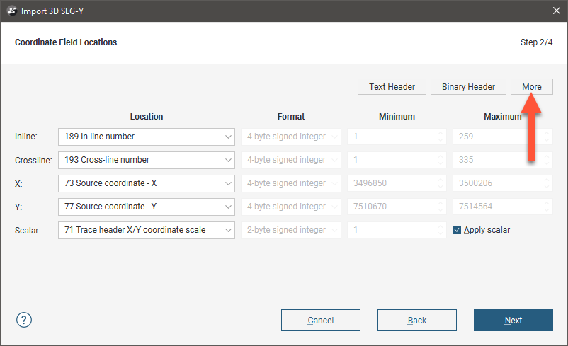 Click Next to move on to setting the Coordinate Field Locations. In this step, the More button displays the trace header fields: