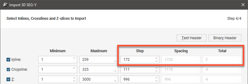 This launches the Import 3D SEG-Y window once again and you can select additional slices by changing the Minimum, Maximum or Step values in the last step.