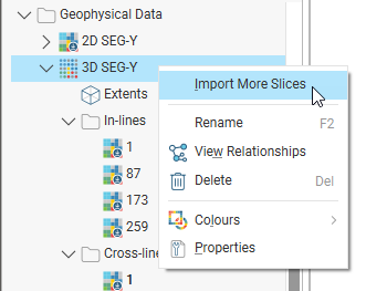 Once you have imported 3D SEG-Y data into a Leapfrog Works project, you can add more slices and delete existing slices if you need to. This is described below.