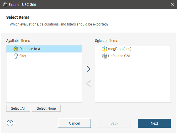 Choose which evaluations, calculations and filters will be included in the exported file. Items added to the Selected items list will appear in the exported file as columns, and the order of columns in the file will match the order shown in the project tree.