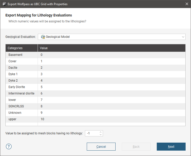 When a 3D grid is exported in UBC format with a category evaluation, category data is mapped to an editable numeric value. If the grid has any category evaluations, you will first be prompted to check the numeric values used for each category: