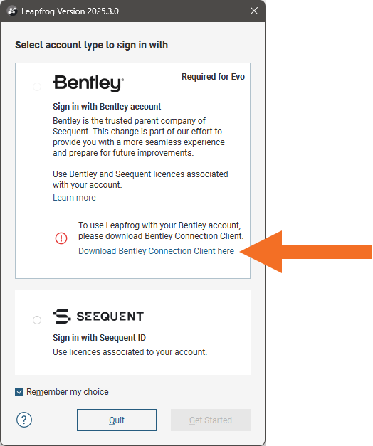 - Choose the type of licence you will be signing in with, a Bentley account licence or a Seequent ID licence. If you will always be signing in with that licence type, enable Remember my choice.