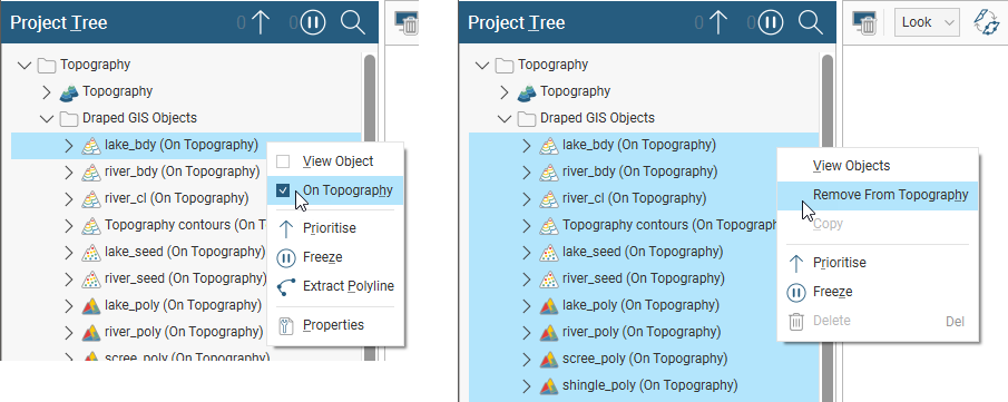 To remove an object from the topography, right-click on either it or its draped copy in the Draped GIS Objects folder and untick the On Topography box. For multiple objects, select Remove From Topography.