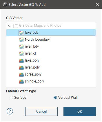 - GIS vector data. Select from the GIS vector data available in the project and click OK.