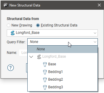 Select the Existing Structural Data option to use a table in the Structural Modelling folder. With this option, you will be able to select from the categories available in the data table, if query filters have been created for those categories: