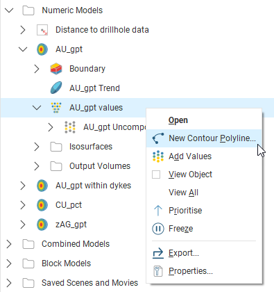 Adding a contour polyline is a useful tool for manually adjusting a surface to make it more geologically reasonable. To start adding a contour polyline, draw a slice where you wish to adjust the surface and decide what value you will assign to the contour line. Next, right-click on the values object and select New Contour Polyline. The next step is to choose whether you will draw a new polyline or use one already in the project: