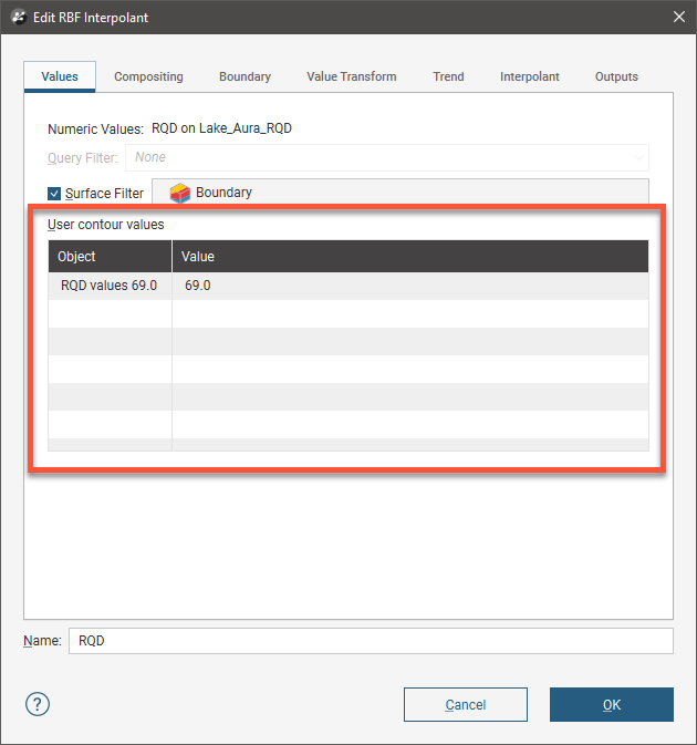 In older versions of Leapfrog Works, the values used for an RBF interpolant could not be changed once it had been created. In Leapfrog Works 2024.1, you can now changes the values used.