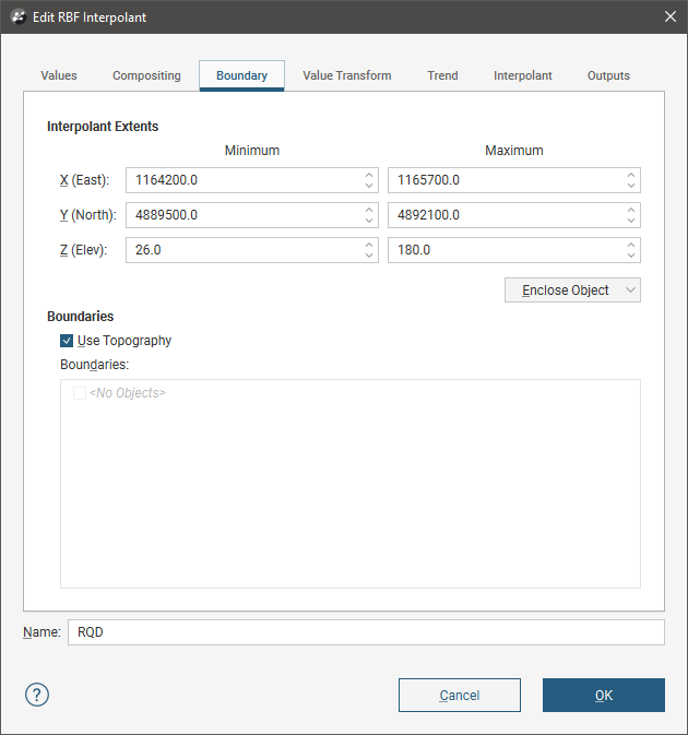 - Select another object in the project from the Enclose Object list, which could be the numeric values object being interpolated. The extents for that object will be used as the basis for the Custom boundary dimensions.