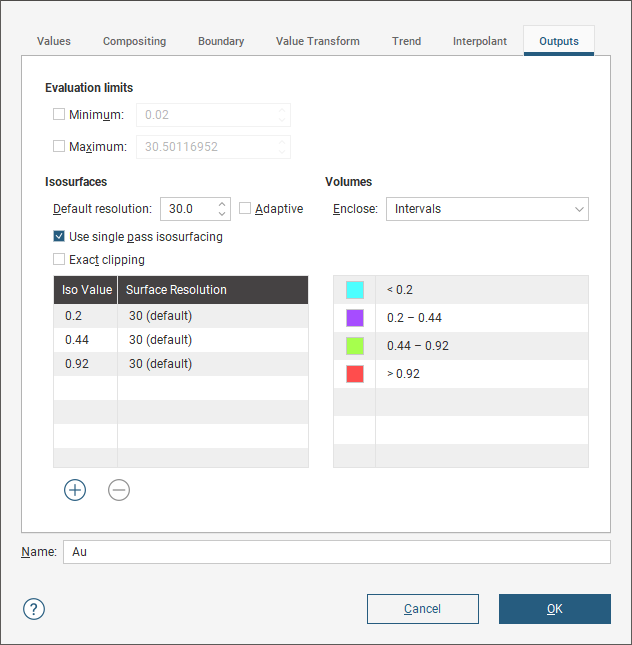 The Volumes enclose option determines whether the interpolant volumes enclose Higher Values, Lower Values or Intervals. Again, this option can be changed once the interpolant has been created.
