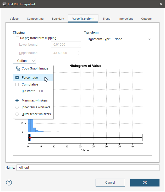 If you tick the Do pre-transform clipping option, you can set the Lower bound and the Upper bound to cap values that are too low or too high. For example, if you set the Upper bound from 14.00 to 10.00, grade values above 10.00 will be regarded as 10.00.