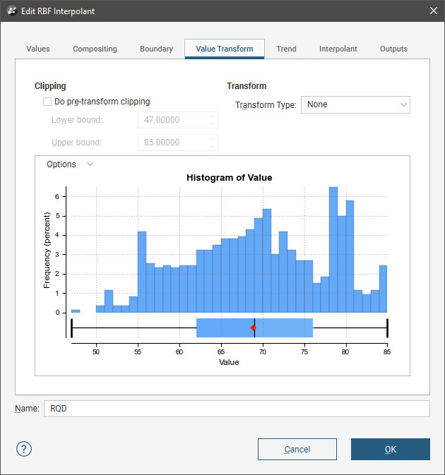To clip data and apply a transformation to an RBF interpolant, double-click on the interpolant in the project tree, then click on the Value Transform tab:
