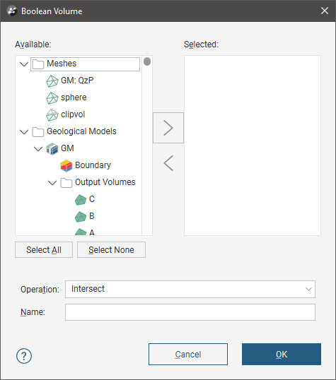 To create a new mesh from two existing closed meshes, right-click on the Meshes folder and select Mesh Operations > Boolean Volume. The Boolean Volume window will appear:
