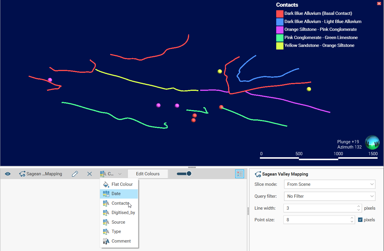 For contact surfaces, the colour of the positive and negative sides of a ribbon will be determined by the lithologies or categories assigned to either side of the surface.