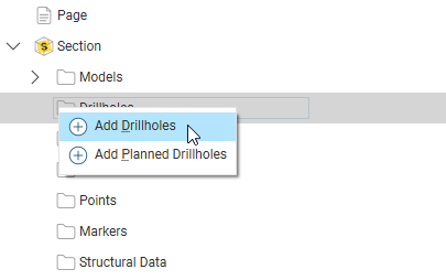 The Boreholes folder contains all boreholes and planned boreholes that have been added to the section layout. To add boreholes to the section, right-click on the Boreholes object and select either Add Boreholes or Add Planned Boreholes.