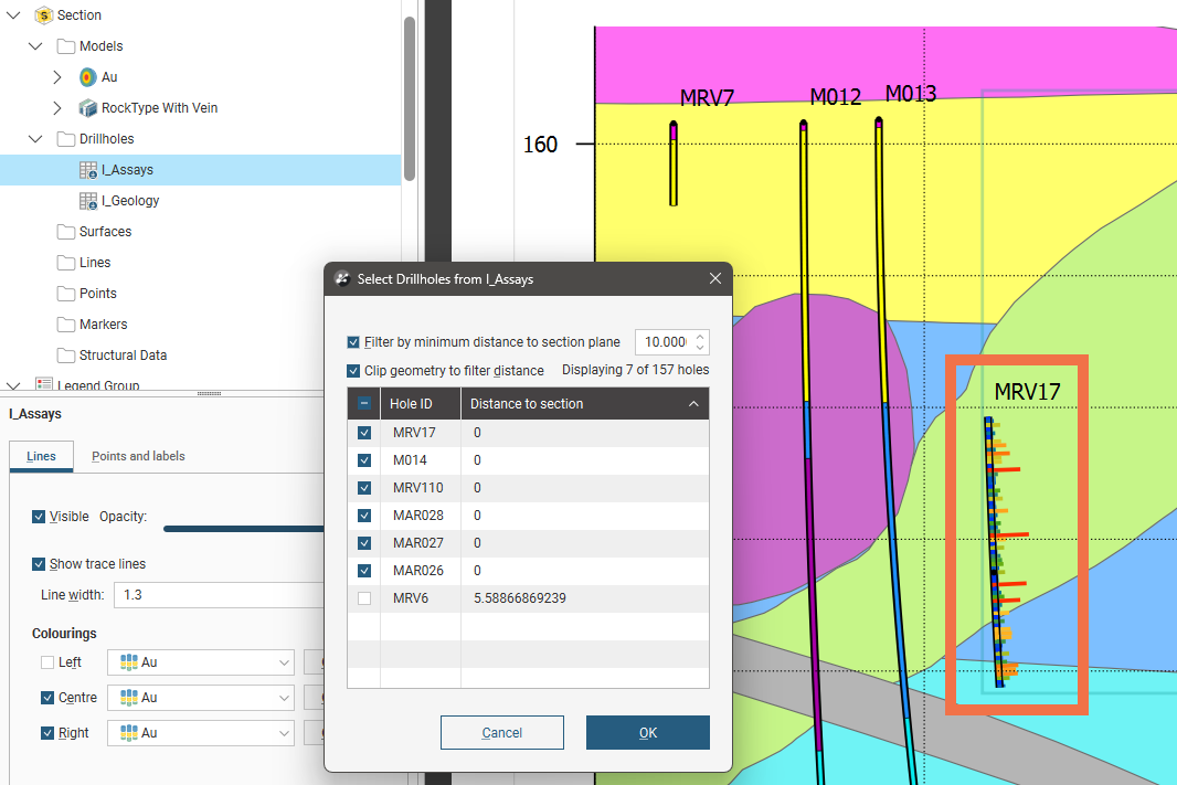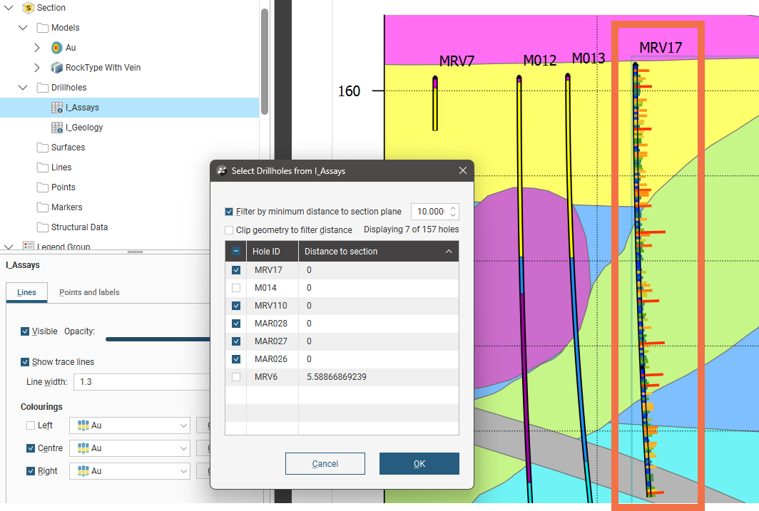 For both the borehole and planned borehole projections, the borehole selection window offers the option to Clip geometry to filter distance. With this selected, only the parts of boreholes that are within the specified minimum distance will be projected onto the section.