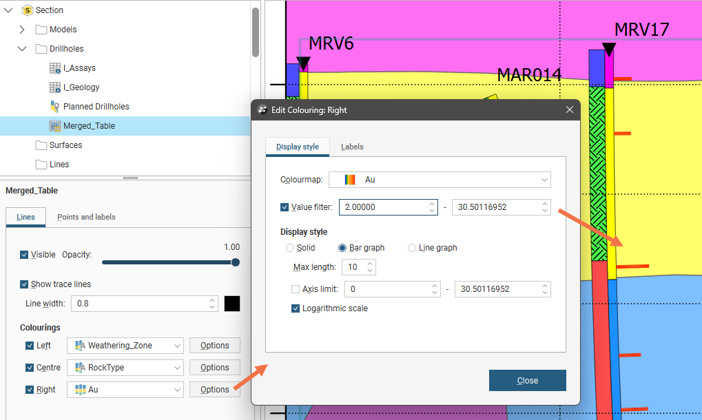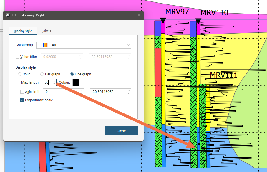 Bar graph and Line graph extend out from the borehole to a specified Max length. Select a Max length that means that displayed data does not interfere with other boreholes or data displayed on the section layout.